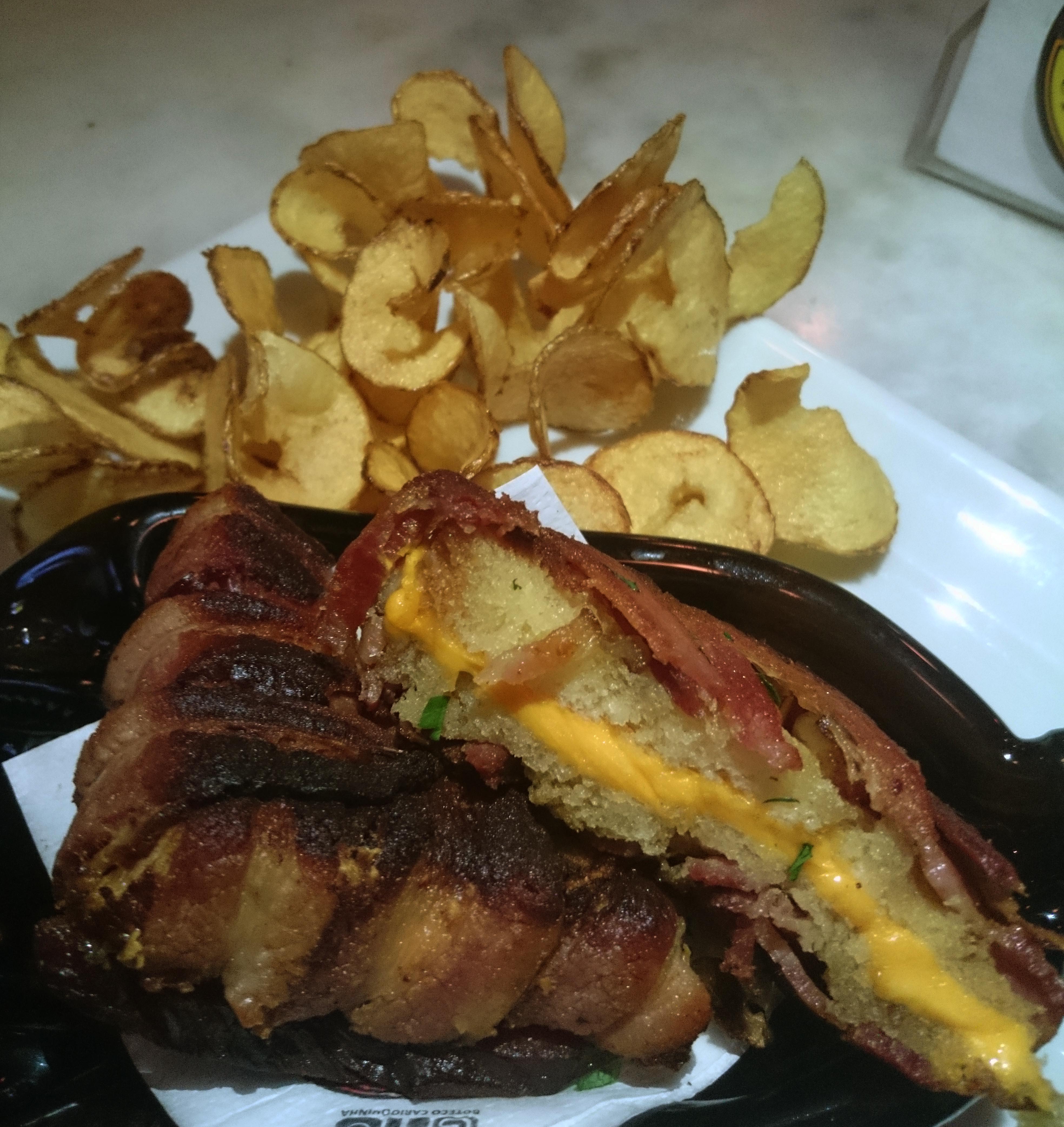 O tempo cervejeiro de Copacabana Pub Escondido, CA oferece aos apaixonados por bacon o burguer 50% Angus Prime 50% Bacon – recheado com mussarela temperada com ervas aromáticas, cebola roxa e tomate, envolvido com bacon servido em um pão de hambúrguer com maionese de alho gratinado acompanhado de tirinhas de bacon empanadas em panco – R$ 45